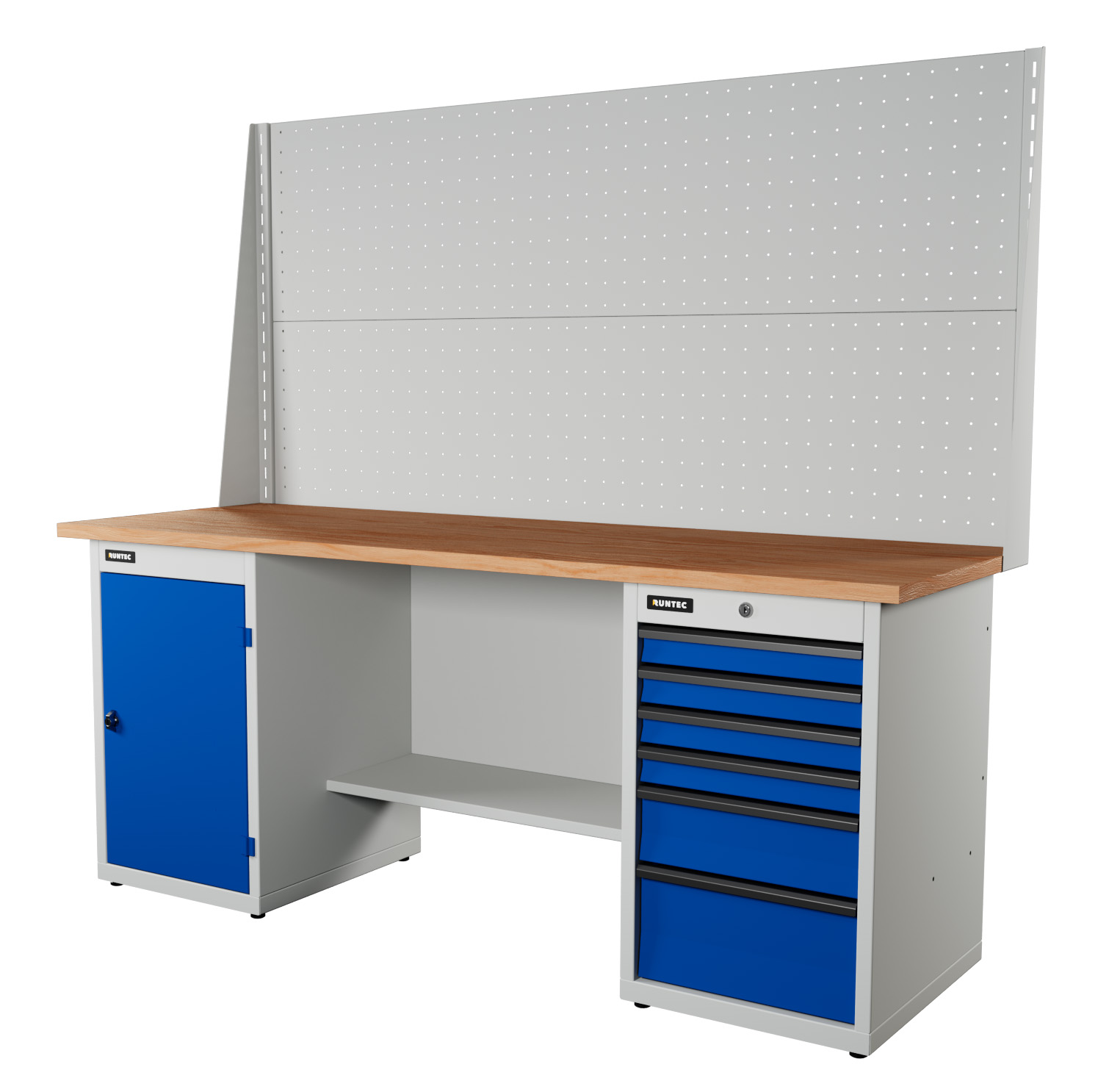 Верстак серии Industrial, 2000 мм, фанера, тумба с дверью + тумба с 6-ю ящиками, экран 1000, синий (светло-серый) RAL 50