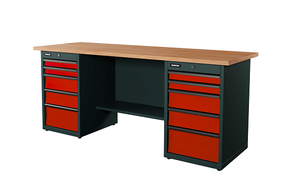 Верстак серии Industrial, 2000 мм, фанера, тумба с 5-ю ящиками + тумба с 5-ю ящиками, красный RAL 3020