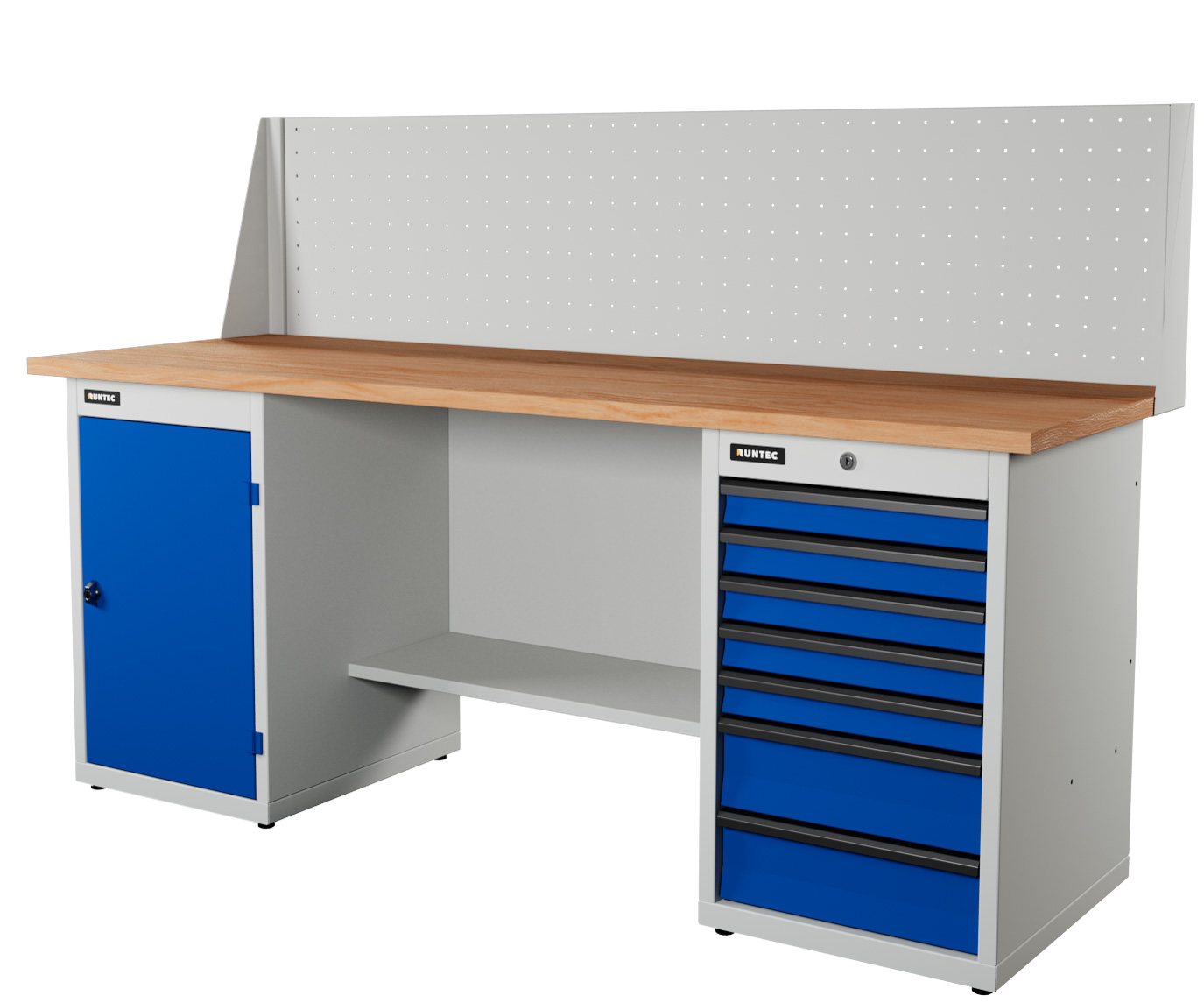 Верстак серии Industrial, 2000 мм, фанера, тумба с 7-ю ящиками + тумба с дверью, экран 500, синий (светло-серый) RAL 500