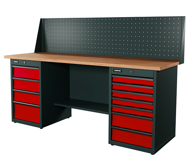 Верстак серии Industrial, 2000 мм, фанера, тумба с 7-ю ящиками + тумба с 4-мя ящиками, экран 500, красный RAL 3020, RUNTEC, RTI20F-TI7-TI4-P20-3020