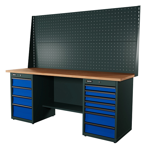Верстак серии Industrial, 2000 мм, фанера, тумба с 7-ю ящиками + тумба с 4-мя ящиками, экран 1000, синий RAL 5005, RUNTEC, RTI20F-TI7-TI4-P20-P20-5005