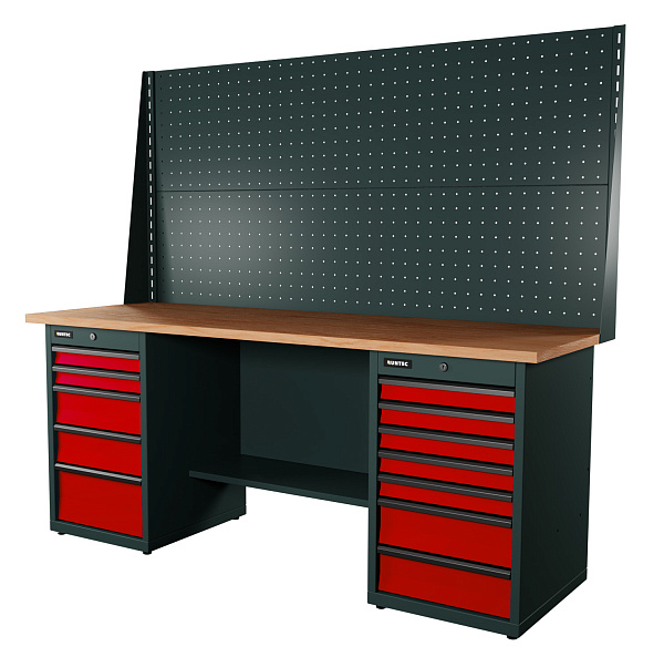 Верстак серии Industrial, 2000 мм, фанера, тумба с 7-ю ящиками + тумба с 5-ю ящиками, экран 1000, красный RAL 3020