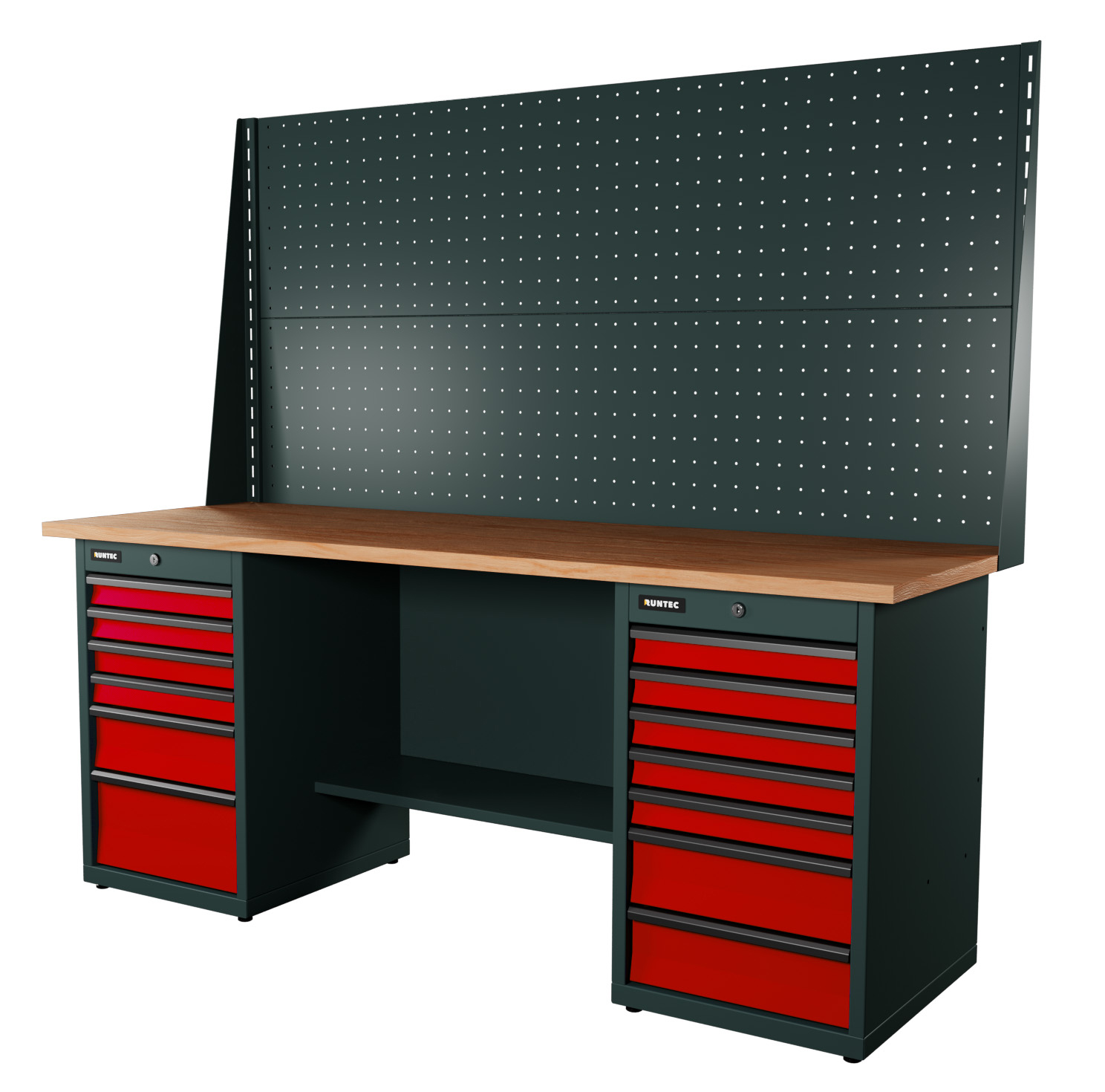 Верстак серии Industrial, 2000 мм, фанера, тумба с 7-ю ящиками + тумба с 6-ю ящиками, экран 1000, красный RAL 3020