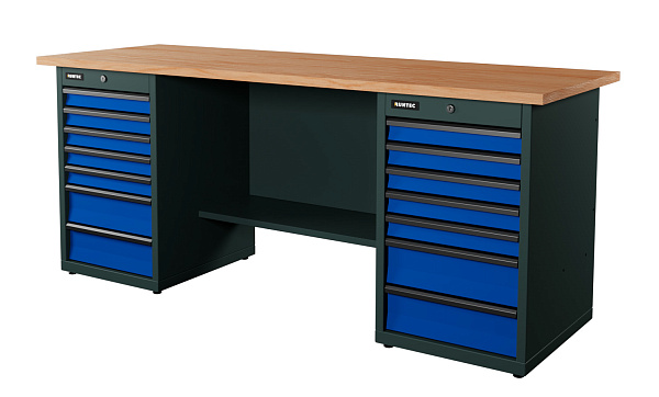 Верстак серии Industrial, 2000 мм, фанера, тумба с 7-ю ящиками + тумба с 7-ю ящиками, синий RAL 5005, RUNTEC, RTI20F-TI7-TI7-5005