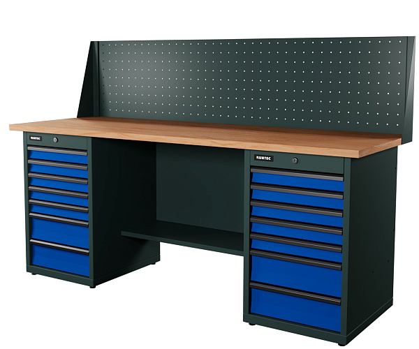 Верстак серии Industrial, 2000 мм, фанера, тумба с 7-ю ящиками + тумба с 7-ю ящиками, экран 500, синий RAL 5005, RUNTEC, RTI20F-TI7-TI7-P20-5005