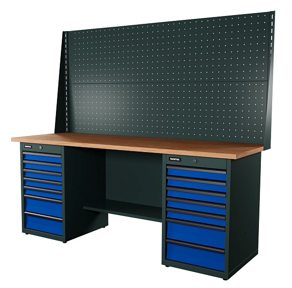 Верстак серии Industrial, 2000 мм, фанера, тумба с 7-ю ящиками + тумба с 7-ю ящиками, экран 1000, синий RAL 5005