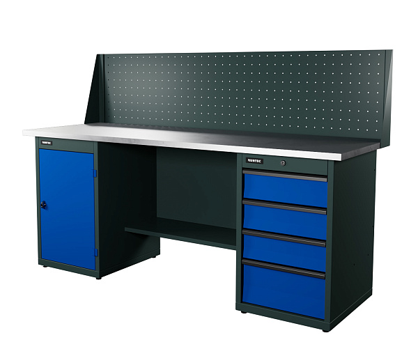 Верстак серии Industrial, 2000 мм, оцинк, тумба с дверью + тумба с 4-мя ящиками, экран 500, синий RAL 5005