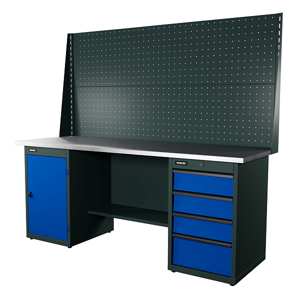 Верстак серии Industrial, 2000 мм, оцинк, тумба с дверью + тумба с 4-мя ящиками, экран 1000, синий RAL 5005