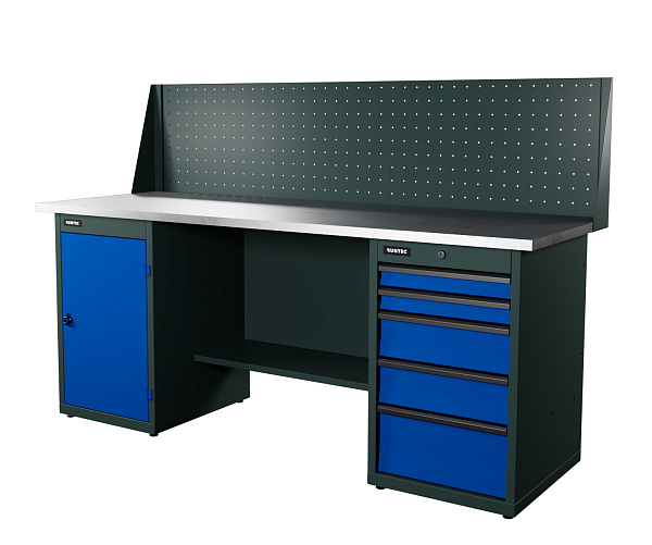 Верстак серии Industrial, 2000 мм, оцинк, тумба с дверью + тумба с 5-ю ящиками, экран 500, синий RAL 5005