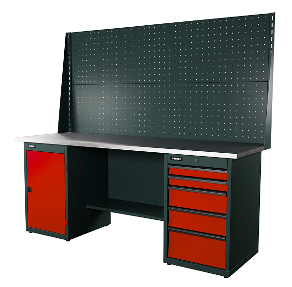 Верстак серии Industrial, 2000 мм, оцинк, тумба с дверью + тумба с 5-ю ящиками, экран 1000, красный RAL 3020, RUNTEC, RTI20Z-TI0-TI5-P20-P20-3020