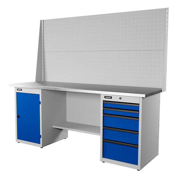 Верстак серии Industrial, 2000 мм, оцинк, тумба с дверью + тумба с 5-ю ящиками, экран 1000, синий (светло-серый) RAL 500