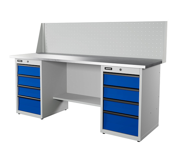 Верстак серии Industrial, 2000 мм, оцинк, тумба с 4-мя ящиками + тумба с 4-мя ящиками, экран 500, синий (светло-серый) R
