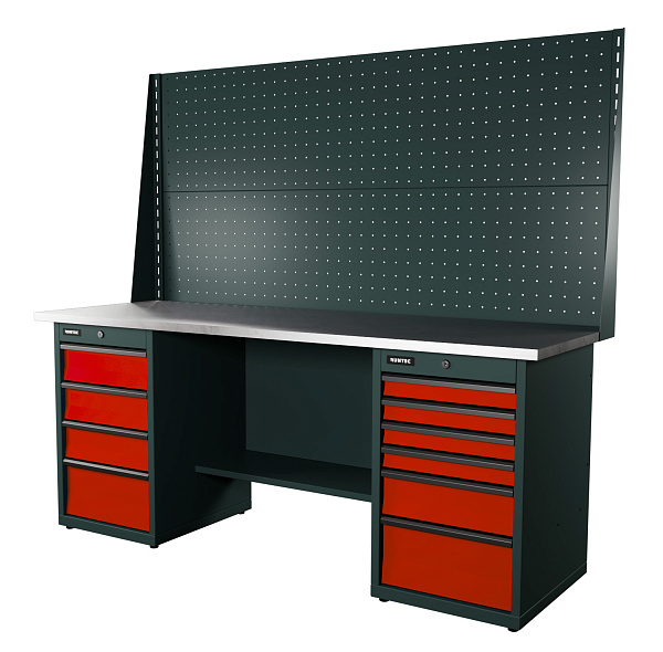 Верстак серии Industrial, 2000 мм, оцинк, тумба с 4-мя ящиками + тумба с 6-ю ящиками, экран 1000, красный RAL 3020, RUNTEC, RTI20Z-TI4-TI6-P20-P20-3020
