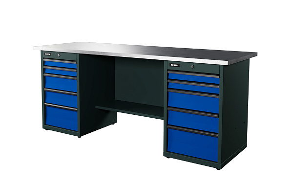 Верстак серии Industrial, 2000 мм, оцинк, тумба с 5-ю ящиками + тумба с 5-ю ящиками, синий RAL 5005, RUNTEC, RTI20Z-TI5-TI5-5005