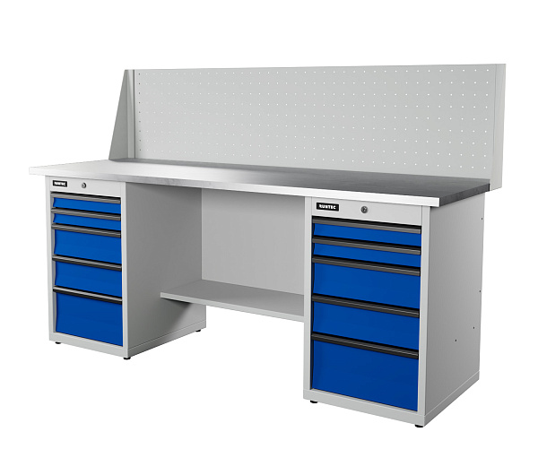 Верстак серии Industrial, 2000 мм, оцинк, тумба с 5-ю ящиками + тумба с 5-ю ящиками, экран 500, синий (светло-серый) RAL