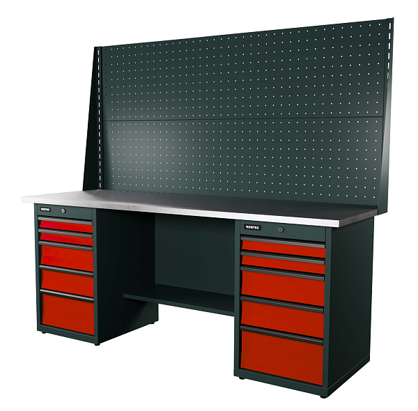 Верстак серии Industrial, 2000 мм, оцинк, тумба с 5-ю ящиками + тумба с 5-ю ящиками, экран 1000, красный RAL 3020, RUNTEC, RTI20Z-TI5-TI5-P20-P20-3020