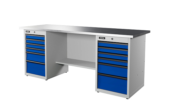 Верстак серии Industrial из конструкционной стали. Встроенные замки с системой Easy Lock позволяют закрыть все ящики одним поворотом ключа. Верстак рассчитан на распределенную нагрузку до 1500 кг.