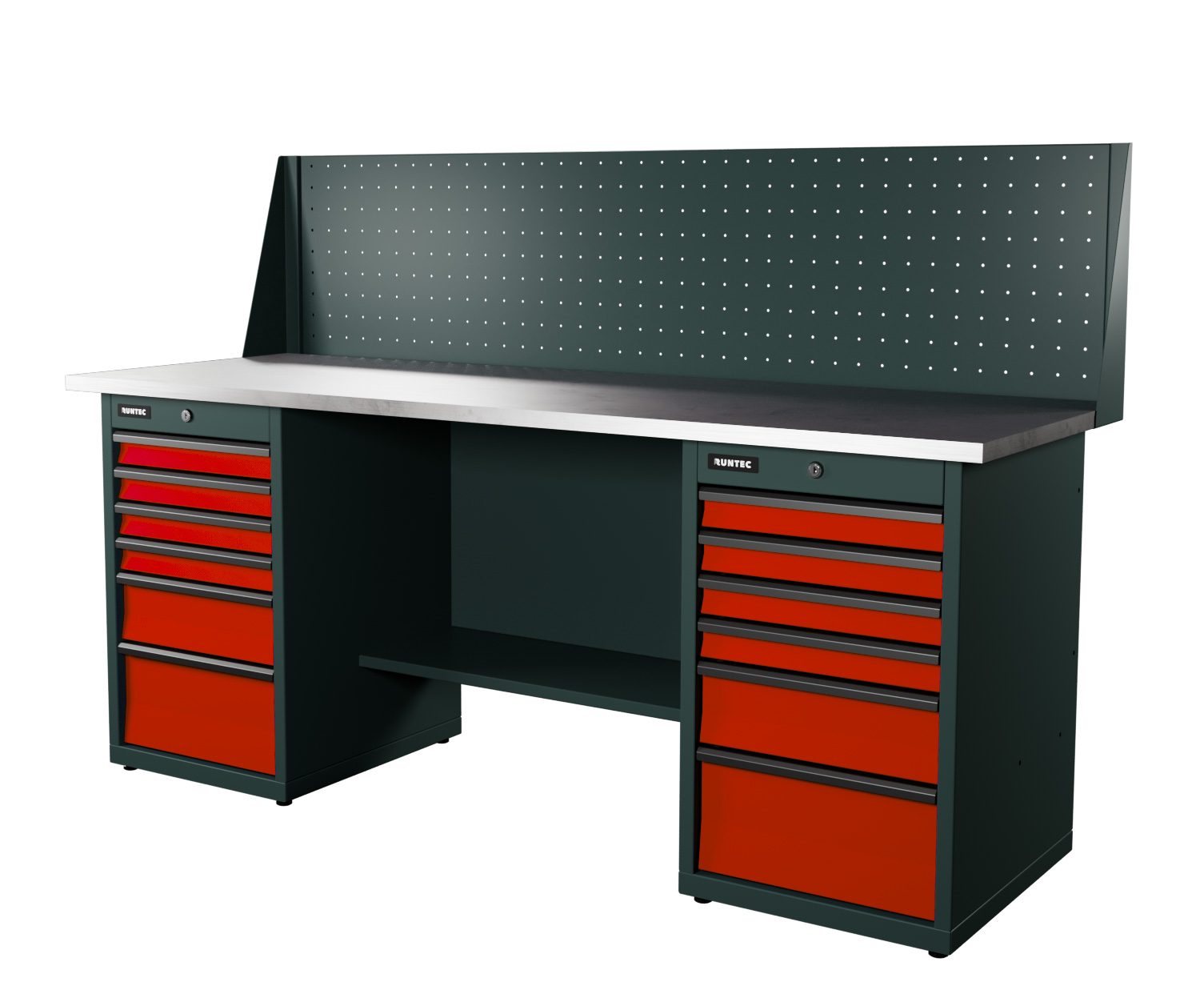 Верстак серии Industrial, 2000 мм, оцинк, тумба с 6-ю ящиками + тумба с 6-ю ящиками, экран 500, красный RAL 3020