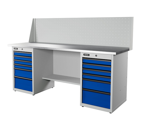 Верстак серии Industrial, 2000 мм, оцинк, тумба с 6-ю ящиками + тумба с 6-ю ящиками, экран 500, синий (светло-серый) RAL