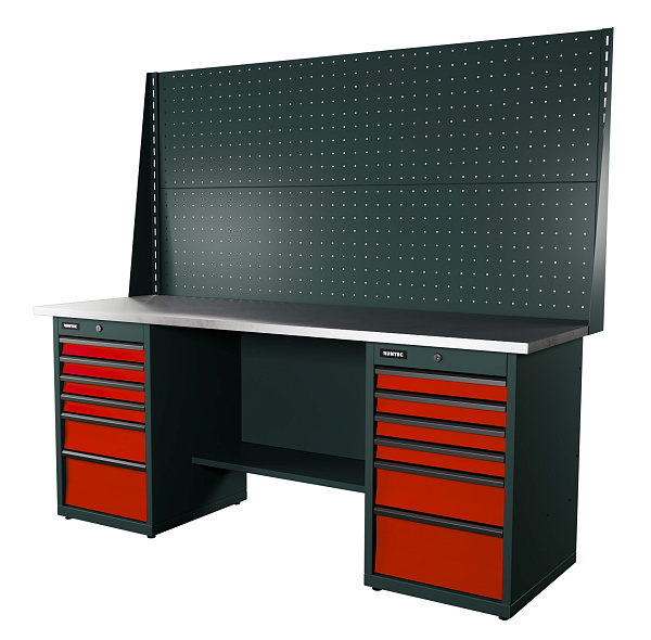 Верстак серии Industrial, 2000 мм, оцинк, тумба с 6-ю ящиками + тумба с 6-ю ящиками, экран 1000, красный RAL 3020, RUNTEC, RTI20Z-TI6-TI6-P20-P20-3020