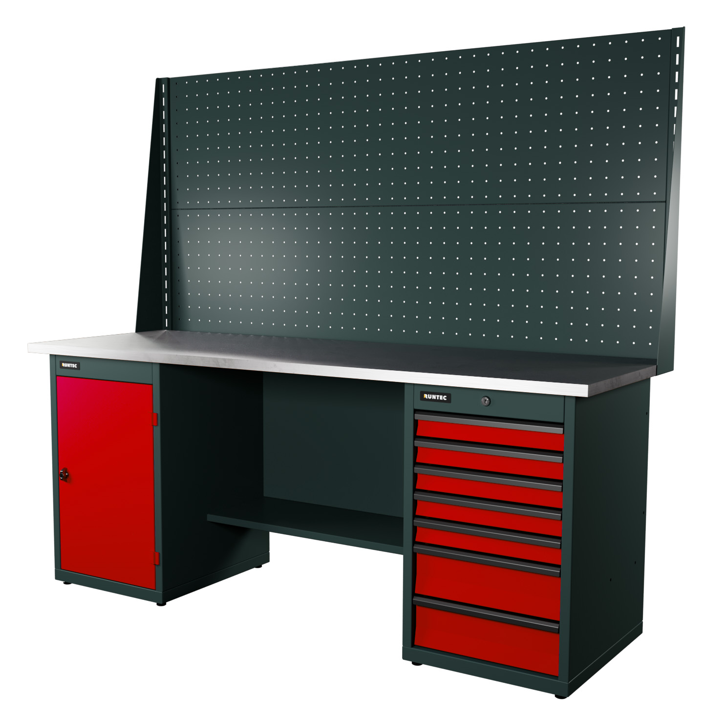 Верстак серии Industrial, 2000 мм, оцинк, тумба с 7-ю ящиками + тумба с дверью, экран 1000, красный RAL 3020