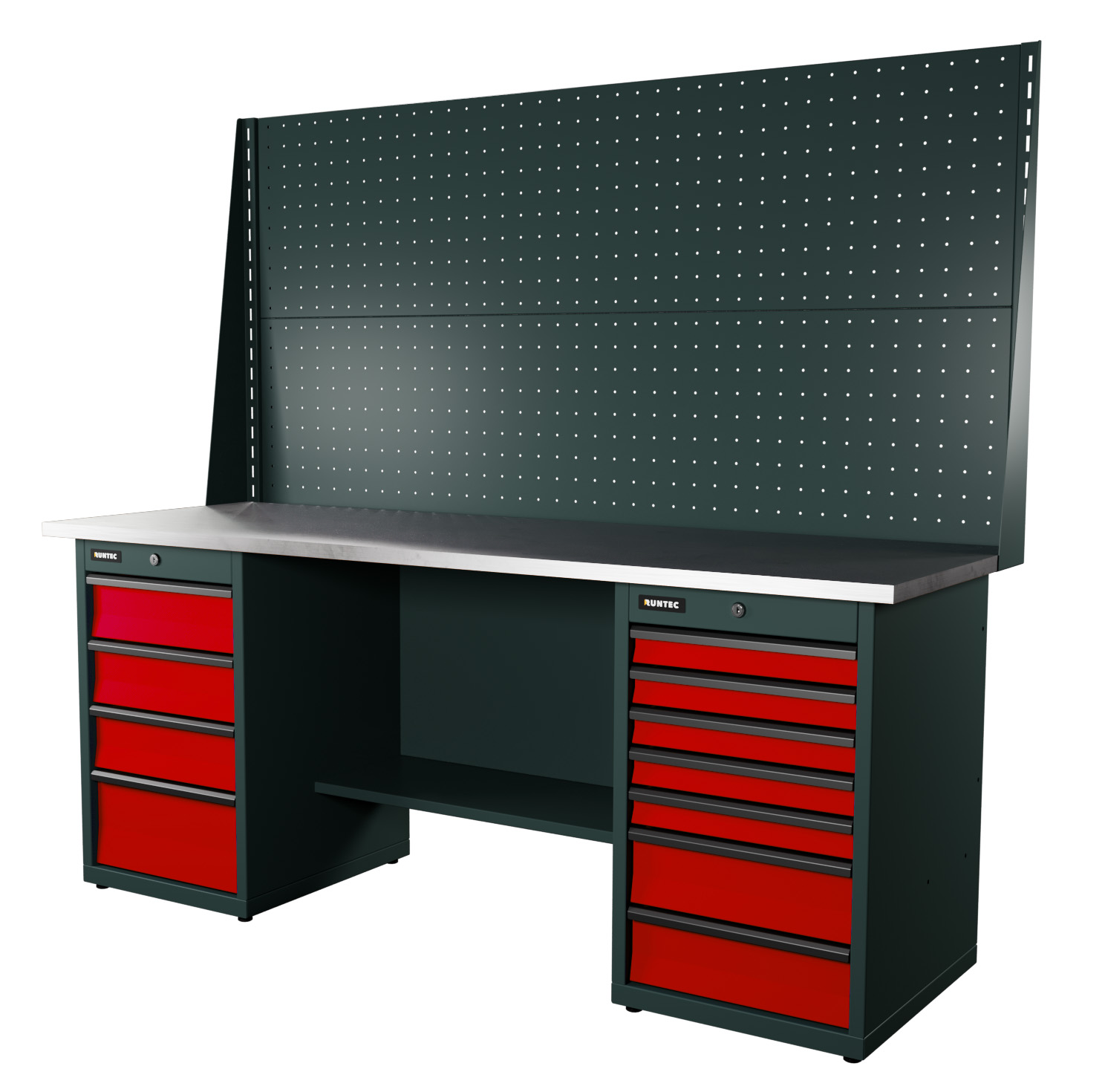 Верстак серии Industrial, 2000 мм, оцинк, тумба с 7-ю ящиками + тумба с 4-мя ящиками, экран 1000, красный RAL 3020