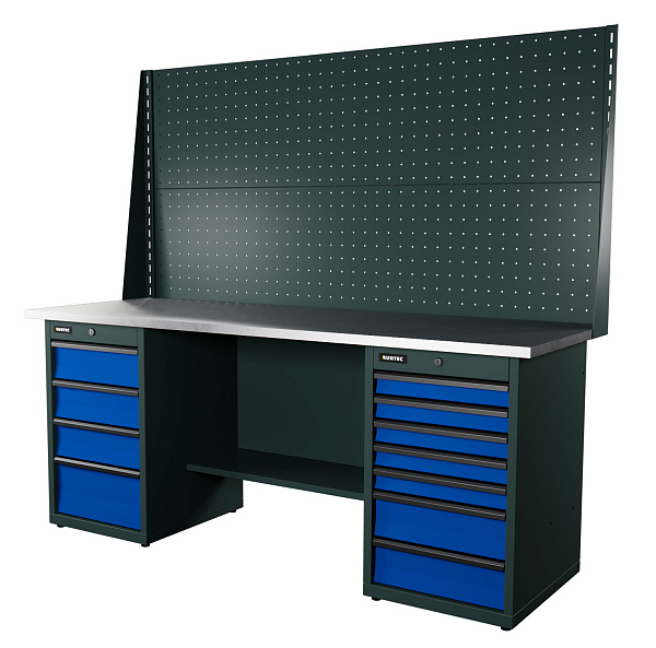 Верстак серии Industrial, 2000 мм, оцинк, тумба с 7-ю ящиками + тумба с 4-мя ящиками, экран 1000, синий RAL 5005