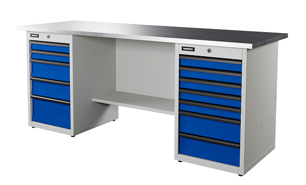 Верстак серии Industrial из конструкционной стали. Встроенные замки с системой Easy Lock позволяют закрыть все ящики одним поворотом ключа. Верстак рассчитан на распределенную нагрузку до 1500 кг.