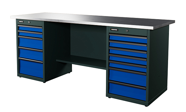 Верстак серии Industrial из конструкционной стали. Встроенные замки с системой Easy Lock позволяют закрыть все ящики одним поворотом ключа. Верстак рассчитан на распределенную нагрузку до 1500 кг.