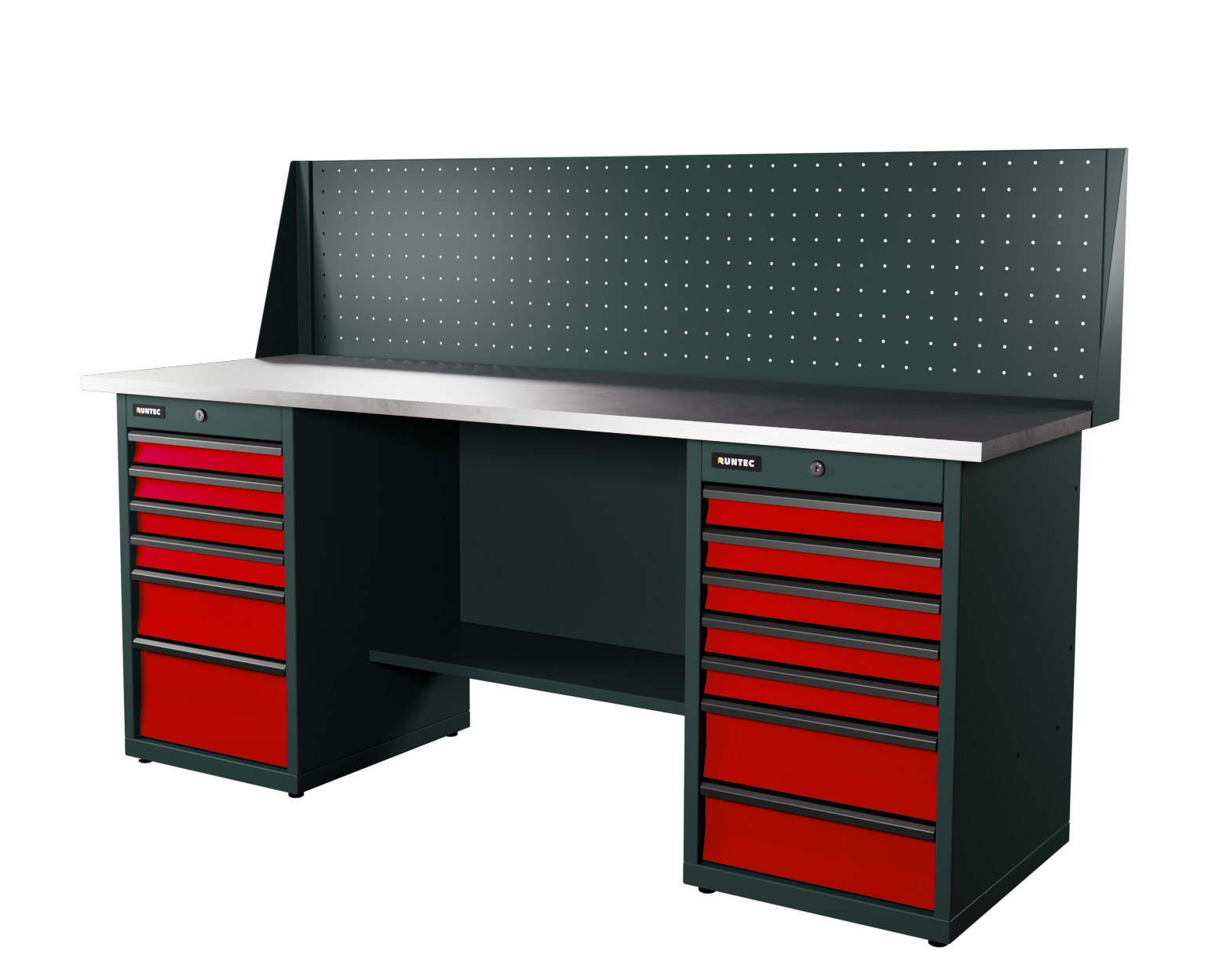 Верстак серии Industrial, 2000 мм, оцинк, тумба с 7-ю ящиками + тумба с 6-ю ящиками, экран 500, красный RAL 3020