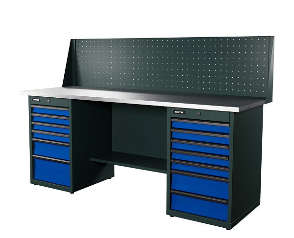 Верстак серии Industrial, 2000 мм, оцинк, тумба с 7-ю ящиками + тумба с 6-ю ящиками, экран 500, синий RAL 5005, RUNTEC, RTI20Z-TI7-TI6-P20-5005