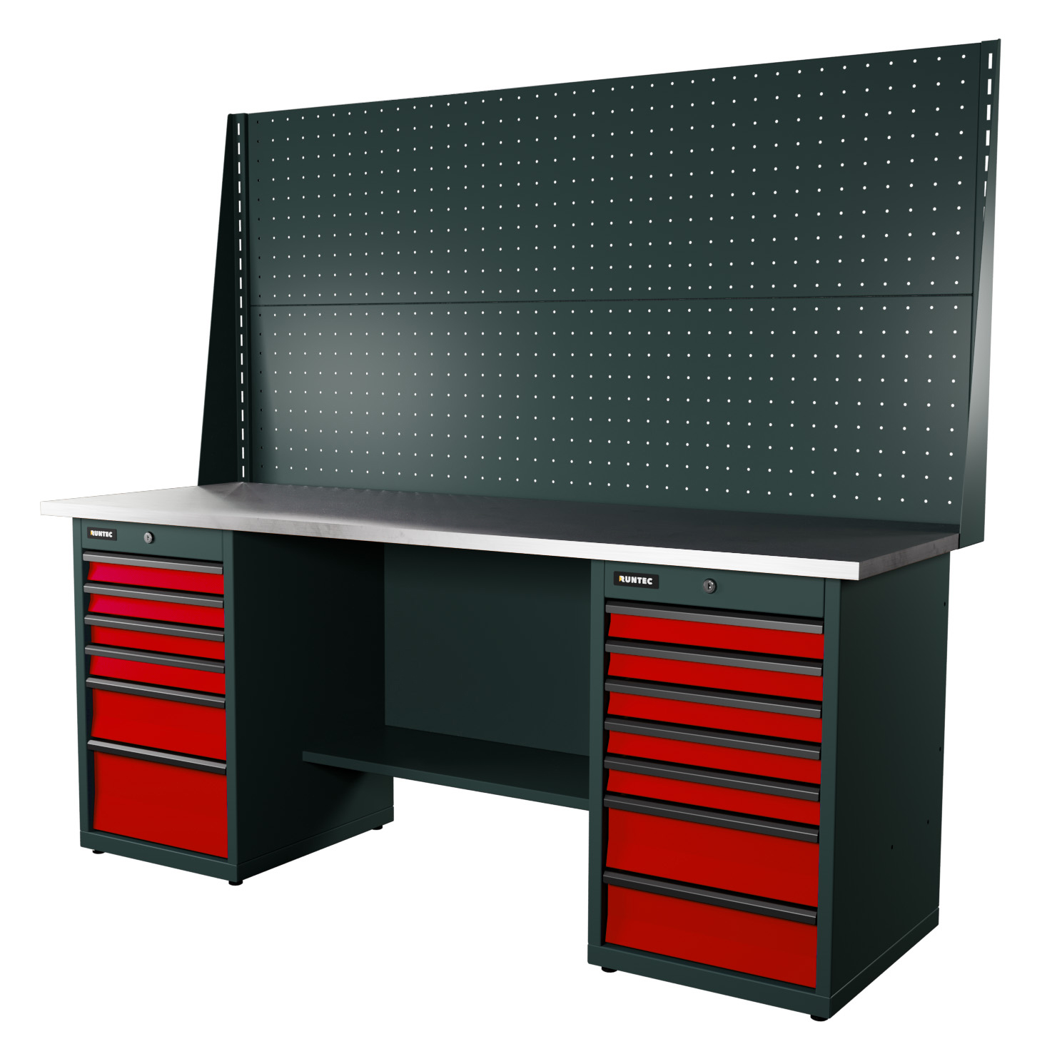 Верстак серии Industrial, 2000 мм, оцинк, тумба с 7-ю ящиками + тумба с 6-ю ящиками, экран 1000, красный RAL 3020