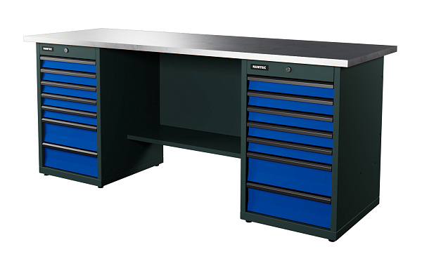Верстак серии Industrial, 2000 мм, оцинк, тумба с 7-ю ящиками + тумба с 7-ю ящиками, синий RAL 5005, RUNTEC, RTI20Z-TI7-TI7-5005