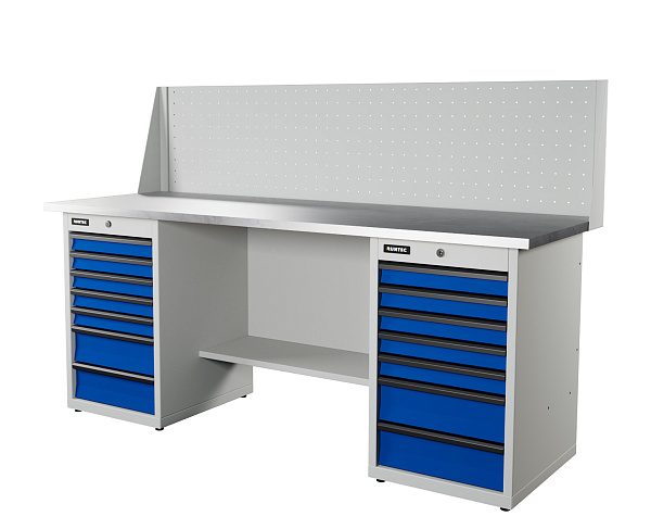 Верстак серии Industrial, 2000 мм, оцинк, тумба с 7-ю ящиками + тумба с 7-ю ящиками, экран 500, синий (светло-серый) RAL