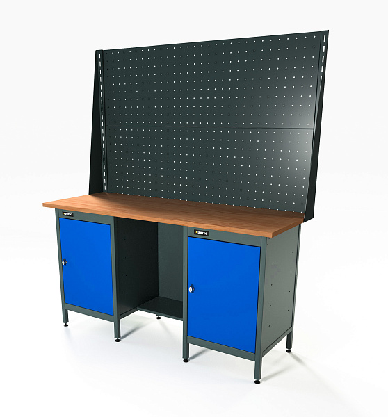Верстак серии Standart, 1600 мм, фанера, тумба с дверью + тумба с дверью, экран 1000, синий RAL 5005