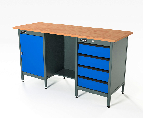 Верстак серии Standart, 1600 мм, фанера, тумба с дверью + тумба с 4-мя ящиками, синий RAL 5005