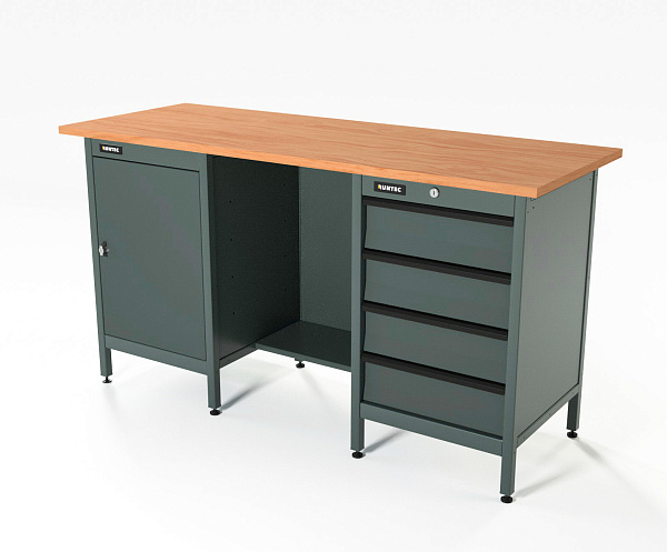 Верстак серии Standart, 1600 мм, фанера, тумба с дверью + тумба с 4-мя ящиками, серый RAL 7016