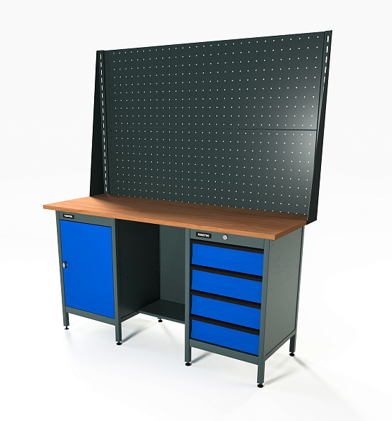 Верстак серии Standart, 1600 мм, фанера, тумба с дверью + тумба с 4-мя ящиками, экран 1000, синий RAL 5005