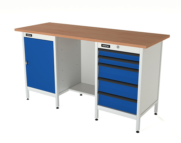 Верстак серии Standart, 1600 мм, фанера, тумба с дверью + тумба с 5-ю ящиками, синий (светло-серый) RAL 5005 (7035)
