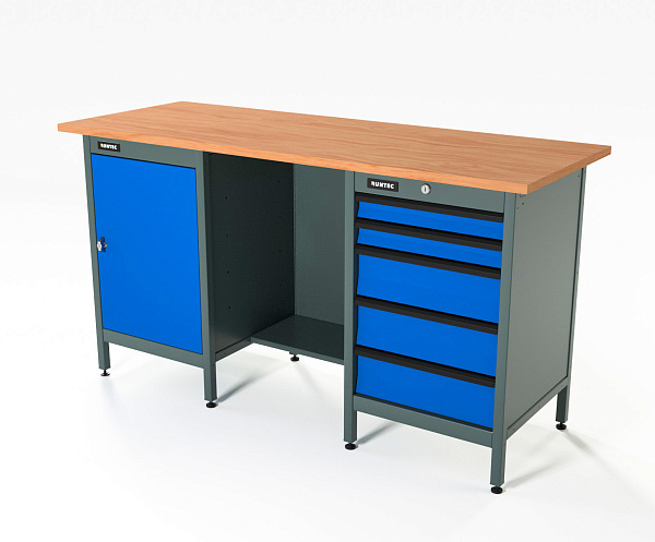 Верстак серии Standart, 1600 мм, фанера, тумба с дверью + тумба с 5-ю ящиками, синий RAL 5005