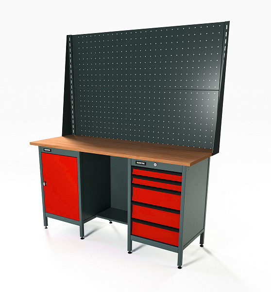Верстак серии Standart, 1600 мм, фанера, тумба с дверью + тумба с 5-ю ящиками, экран 1000, красный RAL 3020