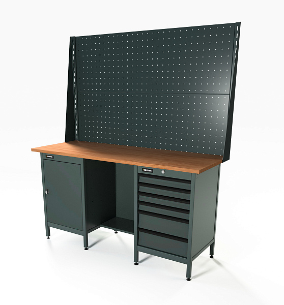 Верстак серии Standart, 1600 мм, фанера, тумба с дверью + тумба с 6-ю ящиками, экран 1000, серый RAL 7016, RUNTEC, RTS16F-TS0-TS6-P16-P16-7016