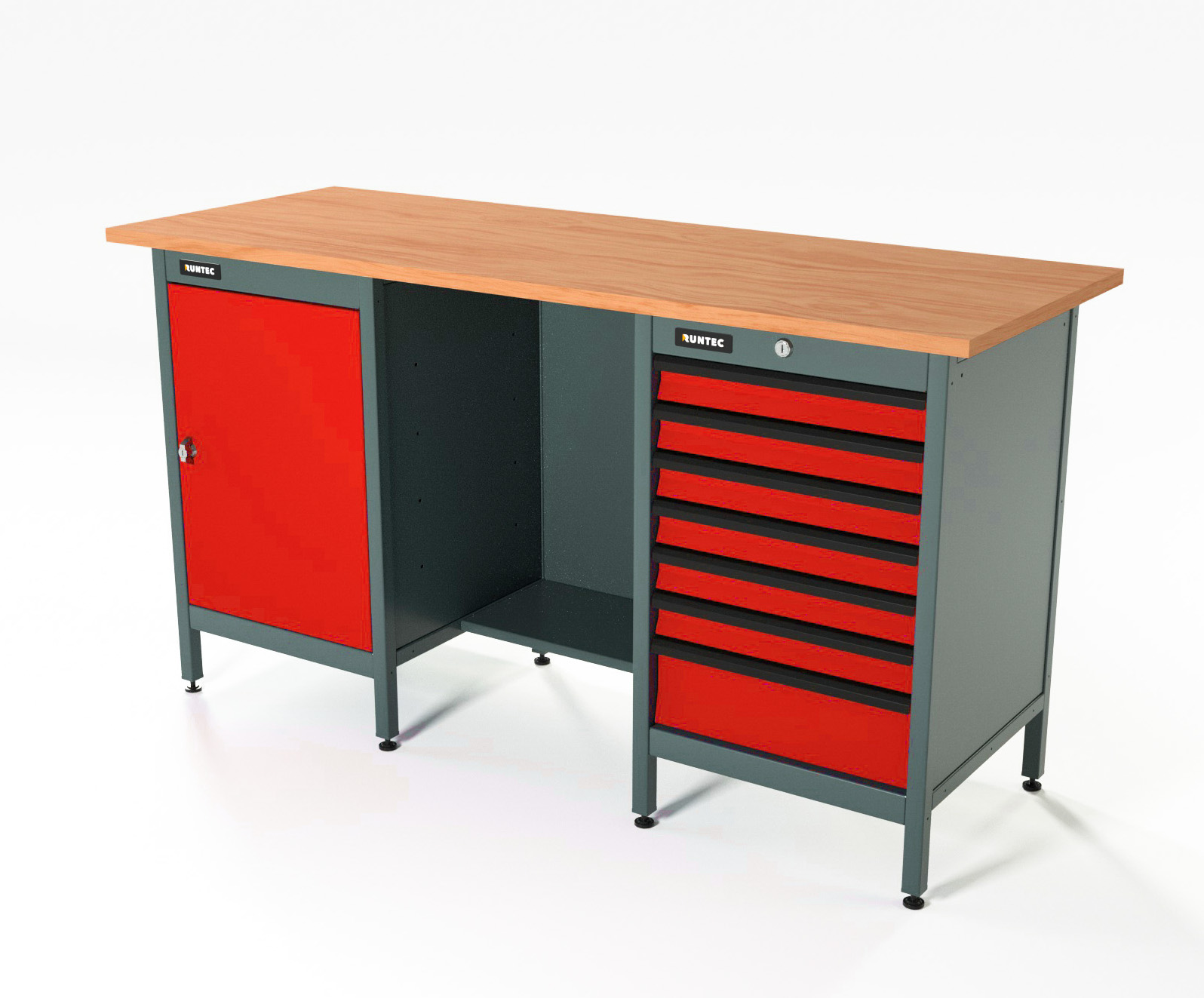 Верстак серии Standart, 1600 мм, фанера, тумба с дверью + тумба с 7-ю ящиками, красный RAL 3020