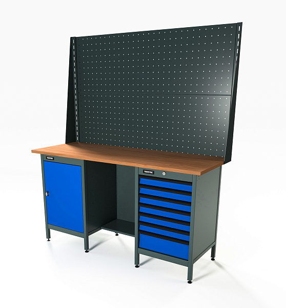 Верстак серии Standart, 1600 мм, фанера, тумба с дверью + тумба с 7-ю ящиками, экран 1000, синий RAL 5005, RUNTEC, RTS16F-TS0-TS7-P16-P16-5005