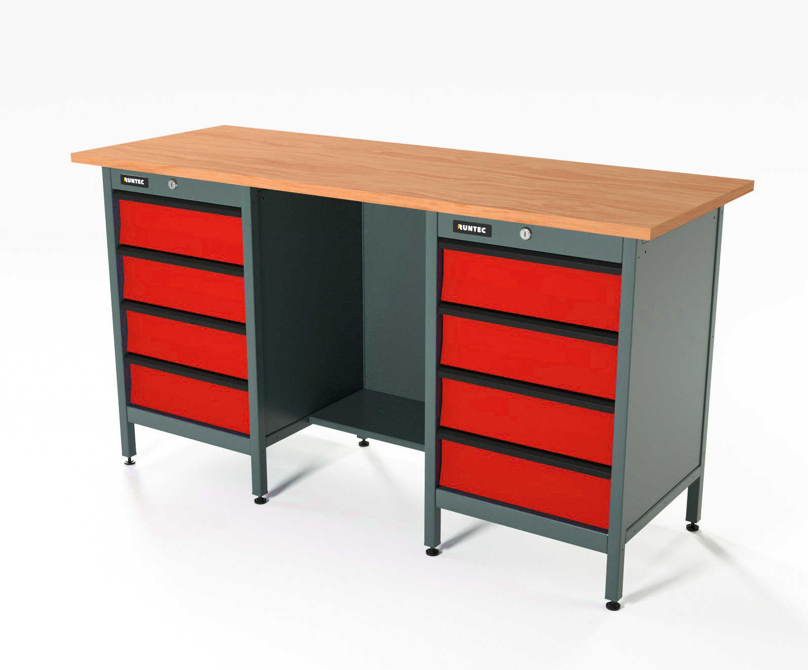 Верстак серии Standart, 1600 мм, фанера, тумба с 4-мя ящиками + тумба с 4-мя ящиками, красный RAL 3020