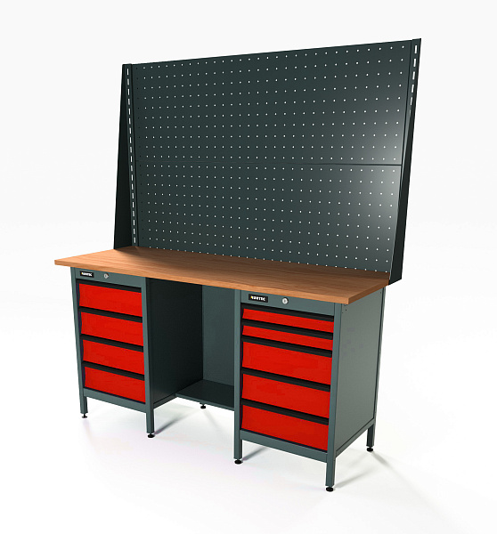 Верстак серии Standart, 1600 мм, фанера, тумба с 4-мя ящиками + тумба с 5-ю ящиками, экран 1000, красный RAL 3020, RUNTEC, RTS16F-TS4-TS5-P16-P16-3020