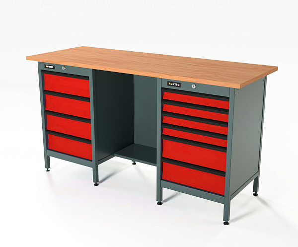 Верстак серии Standart, 1600 мм, фанера, тумба с 4-мя ящиками + тумба с 6-ю ящиками, красный RAL 3020