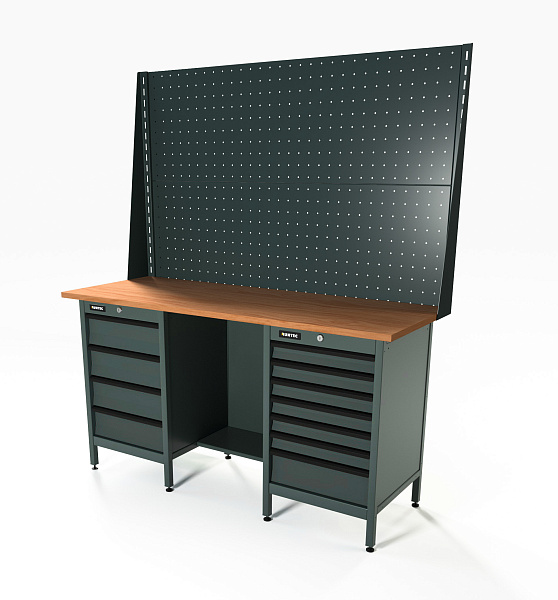 Верстак серии Standart, 1600 мм, фанера, тумба с 4-мя ящиками + тумба с 7-ю ящиками, экран 1000, серый RAL 7016