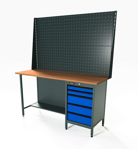 Верстак серии Standart, 1600 мм, фанера, тумба с 5-ю ящиками, экран 1000, синий RAL 5005