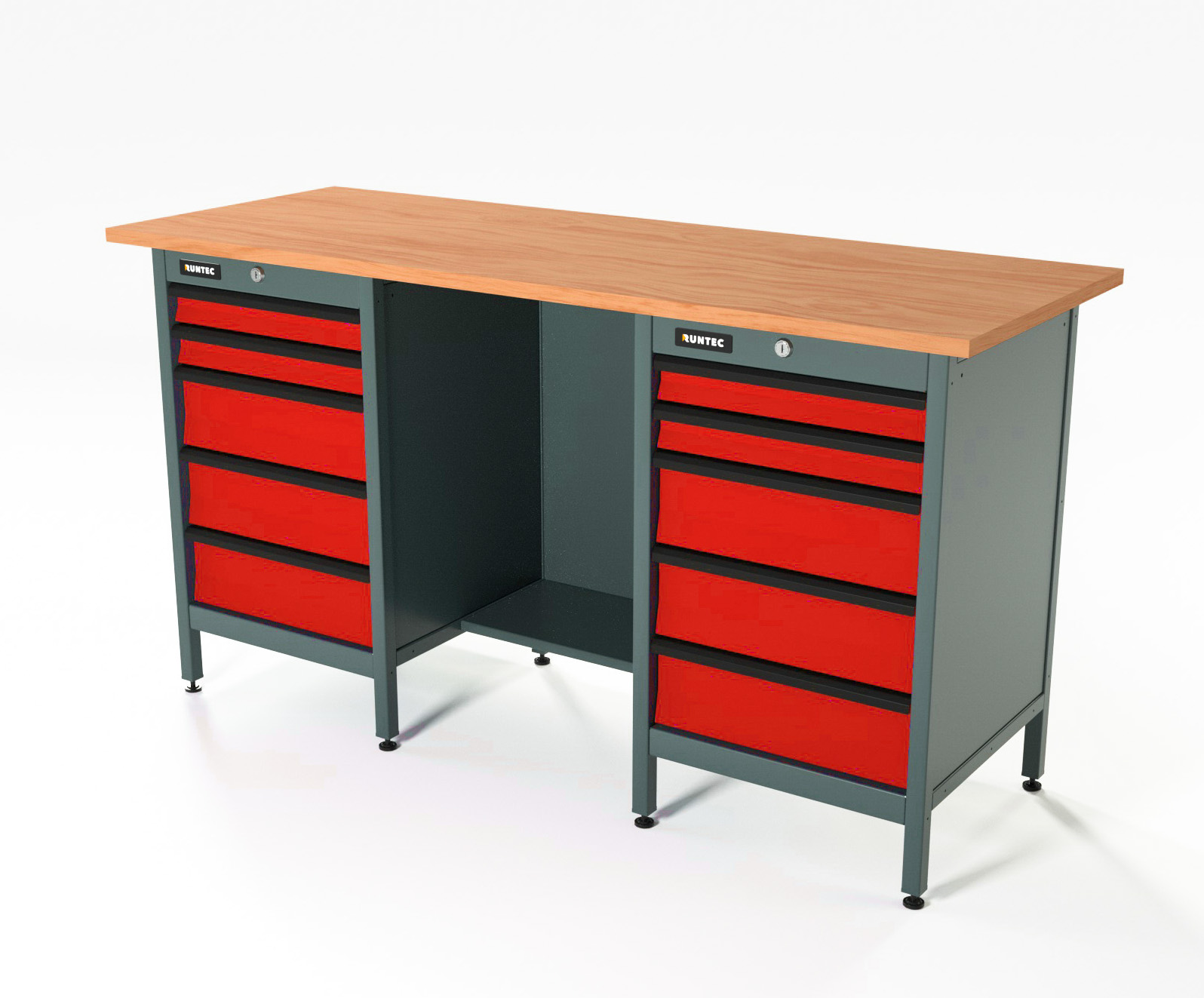 Верстак серии Standart, 1600 мм, фанера, тумба с 5-ю ящиками + тумба с 5-ю ящиками, красный RAL 3020